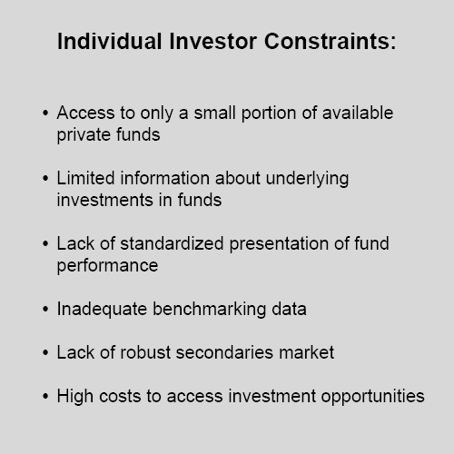In contrast to the amount of information available about public market issuers and fund managers, individual investors face a number of constraints as they pursue private market investments.
